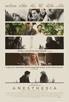 Anesthesia is a 2015 independent drama film written, produced and directed by Tim Blake Nelson. Nelson stars in the film with Sam Waterston, Kristen Stewart, Glenn Close, Gretchen Mol, and Corey Stoll. The film premiered at the Tribeca Film Festival on April 22, 2015.[2] The film was released in a limited release and through video on demand by IFC Films on January 8, 2016.[3]