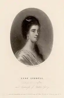Anne FitzPatrick, Countess of Upper Ossory (née Liddell, also known as Anne FitzRoy, Duchess of Grafton; c. 1737 – 1804) was an English noblewoman and the first wife of Augustus FitzRoy, 3rd Duke of Grafton. Grafton divorced her while serving as Prime Minister. She was a noted correspondent of Horace Walpole.