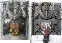 By his mistress Gwenlina Stradling, a daughter of William Stradling[7] of St Donat's Castle in Glamorgan, Wales, he had one illegitimate daughter named Margaret, who married Sir Robert Poyntz (d. 1520) lord of the manor of Iron Acton in Gloucestershire, who built the Poyntz Chapel within the Gaunt's Chapel in Bristol. The stone ceiling boss of the Poyntz Chapel displays in relief sculpture the arms of Poyntz (of 4 quarters) impaling the arms of Woodville (of 6 quarters, 3rd quarter Woodville), and the two wooden end-panels of his monumental coffin, decorated with the heraldry of Poyntz and Woodville, survive in the Gaunt's Chapel in which he was buried. The Heraldic Visitation of Gloucestershire records that:[8]
