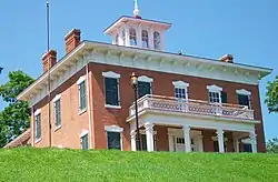 The LeClaire House is a two-story, brick, 14-room Tuscan Italianate mansion on the top of a bluff 125 feet (38 m) above the Mississippi River.[9] The rooms are evenly divided on the two floors.[3] The front square section of the house has four rooms on each floor and there are three rooms in a back wing. A large corridor stretches from the front to the back of the house on both floors. The exterior features a shallow hipped roof, wide, bracketed eaves, and a belvedere on the top of the roof. The house has nine fireplaces, 12-foot (3.7 m) high ceilings, ornate plaster medallions, and a 3-story elliptical staircase. There are also Greek Revival elements to the house as well. They are found in the doorway framed between pilasters and the scroll pediments over the windows. The property originally had a circular drive made of cinders that was lighted with gas lamps. The estate also contained carriage barns, a summer kitchen, an ice house, and a plum grove.[5]
