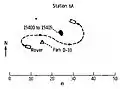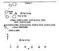 These are maps from the Apollo 15 Preliminary Science Report,[4] edited slightly. In all figures, X indicates sample locations, 5-digit numbers are LRL sample numbers, rectangle is lunar rover (dot indicates TV camera), black spots are large rocks, dashed lines are crater rims or other topographic features, and triangles are panorama stations.