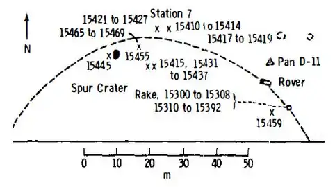 With time running out, and the walk-back constraint approaching, the geology backroom decided that they wanted the astronauts to collect as many small fragments as they could from the area. Irwin had wanted to sample a large breccia but after spending so much time on #15415, there was little time left at the site. They also took some rake samples, netting 78 fragments from the regolith. With only three minutes before they had to move on, Irwin hit a large rock with his scoop, breaking it along one of its fracture lines. The chip they collected would be the second-largest rock collected on the mission.