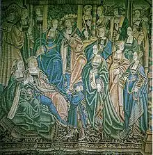 News of Arthur's death reached Henry VII's court late on 4 April.[4] The King was awoken from his sleep by his confessor, who quoted Job by asking Henry "If we receive good things at the hands of God, why may we not endure evil things?" He then told the king that "[his] dearest son hath departed to God," and Henry burst into tears.[52] "Grief-stricken and emotional," he then had his wife brought into his chambers, so that they might "take the painful news together";[53] Elizabeth reminded Henry that God had helped him become king and "had ever preserved him," adding that they had been left with "yet a fair Prince and two fair princesses and that God is where he was, and [they were] both young enough."[54] Soon after leaving Henry's bedchamber, Elizabeth collapsed and began to cry, while the ladies sent for the King, who hurriedly came and "relieved her."[55]