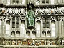 On 8 April, a general procession took place for the salvation of Arthur's soul. That night, a dirge was sung in St Paul's Cathedral and every parish church in London.[56] On 23 April,[3] Arthur's body, which had previously been embalmed,[57] sprinkled with holy water and sheltered with a canopy, was carried out of Ludlow Castle and into the Parish Church of Ludlow by various noblemen and gentlemen.[56] On 25 April, Arthur's body was taken to Worcester Cathedral via the River Severn, in a "special wagon upholstered in black and drawn by six horses, also caparisoned in black."[58] As was customary, Catherine did not attend the funeral.[57] The Earl of Surrey acted as chief mourner.[59] At the end of the ceremony, Sir William Uvedale, Sir Richard Croft and Arthur's household ushers broke their staves of office and threw them into the Prince's grave.[60] During the funeral, Arthur's own arms were shown alongside those of Cadwaladr ap Gruffydd and Brutus of Troy.[4] Two years later, a chantry was erected over Arthur's grave.[3]