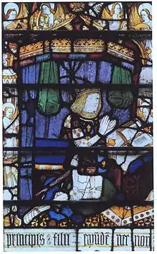 In 2002, following the initiative of canon Ian MacKenzie, Arthur's funeral was reenacted with a requiem mass at Worcester Cathedral, on occasion of the quincentenary of his death. Despite his role in English history, Arthur has remained largely forgotten since his death.[71] The only known portrait of Arthur was rediscovered by English art dealer Philip Mould.[72][73] The stain-glass image of Arthur Tudor praying is in St Laurence's Church in Ludlow Shropshire where he died at the castle in 1502.