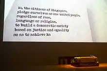 - The remainder of the Singapore National Pledge, which does not appear in the photograph, is "[... so as to achieve ha]ppiness, prosperity and progress for our nation".