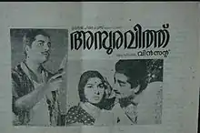 Asuravithu is a 1968 Malayalam film directed by A. Vincent, starring Prem Nazir and Sharada in the lead roles. The film was scripted by M. T. Vasudevan Nair, based on his own novel Asuravithu.[1] Set in a Kerala village in the 1960s, the political melodrama focuses on Hindu-Muslim unity. The film portrays the plight of the protagonist, the youngest son of a proud Nair tharavadu, as he is trapped between the social scenario, social injustice and his own inner consciousness. Prem Nazir's acting in the movie was well appreciated by the viewers.