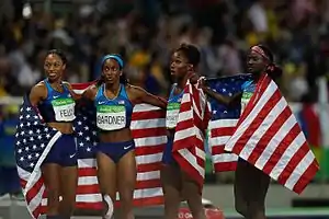 On the ninth and final day of action in the track and field stadium, Matthew Centrowitz Jr. secured a tactical win in the men's 1500 m while Caster Semenya used her sheer speed to win the women's 800 m. Behind her Francine Niyonsaba won only the second ever medal for Burundi at the Olympics. In the women's high jump, Ruth Beitia became Spain's inaugural female Olympic gold medalist in athletics, though this was overshadowed by the fact her winning mark was the lowest since 1980 and she was outperformed by two heptathletes in Rio.[10] Thomas Röhler cleared ninety metres to win the men's javelin throw. Mo Farah became the second most successful track athlete of the 2016 Rio Olympics by defending his 5000 m title, making him one of only two men alongside Finland's Lasse Virén to have defended both long-distance titles at consecutive Olympics. In the last track events of the games, the United States won the men's and women's 4 × 400 metres relays. The women's victory gave Allyson Felix the distinction of setting a medals record for women's Olympic athletics; six gold medals and nine medals overall.[24] In the closing competition of the Olympics, Eliud Kipchoge of Kenya comfortably won the marathon by the largest margin since 1972.[25] The runner-up Feyisa Lilesa of Ethiopia made a political protest by crossing his arms near the finish line in solidarity with the Oromo killed in protests that year and later suggested he would seek asylum.[26]