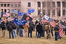 All subsequent "Stop the Steal" groups have since been removed by Facebook moderators over their discussions of extreme violence, incitement to violence, and threats, all of which are violations of Facebook's community standards.[99][100][101] Several "Stop the Steal" groups were founded by right-wing extremists[88] after Trump published tweets on Twitter encouraging his supporters to "Stop the Count".[102] Since then, many of these unorganized "Stop the Steal" groups have started protesting in several U.S. cities, including Washington, D.C.;[103] Detroit, Michigan;[104] Lansing, Michigan;[105] Las Vegas, Nevada;[106][107] Madison, Wisconsin;[108] Atlanta, Georgia;[109] and Columbus, Ohio.[110] Several of these protests have included members of extremist groups such as Three Percenters, Proud Boys, and Oath Keepers, which CNN reported was an illustration of "the thinning of a line between the mainstream right and far-right extremists" to those who track such groups.[111] One antisemitic variant of the conspiracy theory is the idea that billionaire liberal donor George Soros "stole the election".[112]
