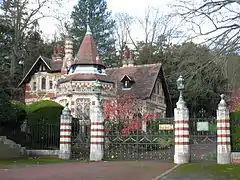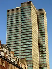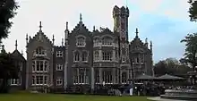 | The film's shooting locations included Oakley Court (top left), Euston Tower (right) and Friar Park (bottom left). | |