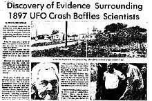 On April 19, 1897, an article in the Dallas Morning News written by S.E. Haydon[lower-alpha 1] described the UFO crash.[2] The UFO is said to have hit a windmill on the property of a Judge J.S. Proctor two days earlier at around 6am local (Central) time,[5] resulting in its crash. The pilot (who was reported to be "not of this world", and a "Martian" according to a reported Army Signal Service officer named T.J. Weems[6] from nearby Fort Worth),[7] did not survive the crash, and was buried "with Christian rites" by a traveling pastor named William Russell Taybor at the nearby Aurora Cemetery. (The cemetery contains a Texas Historical Commission marker mentioning the incident.[8])