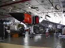 Armament was stored in a large internal bay located in a "belly" position, taking up over one third of the aircraft fuselage. A wide variety of weapons could be deployed from this bay, such as the Hughes Falcon guided missile, the CARDE Velvet Glove air-to-air missile, or four general-purpose 1,000 lb bombs.[27] The Velvet Glove radar-guided missile had been under development with the RCAF for some time, but was believed unsuitable for supersonic speeds and lacked development potential. Consequently, further work on that project was cancelled in 1956.[28]