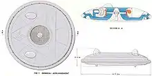 The Avrocar was a disk-shaped aircraft with the same basic shape as a frisbee, the upper surface of the disk being fairly curved, and the bottom much less so. The disk was 18 feet (5.5 m) in diameter and 3.5 feet (1.1 m) thick.[21] The main structural truss was a large equilateral triangle, to which the various components were attached. The 124-blade "turborotor" sat in the center of the triangle, with most of the rotor's thrust directed straight down through an opening in the lower surface, but some was bled off to power the control system running along the outer rim of the disk.[21]