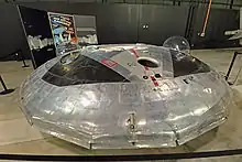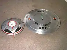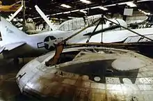 The Avro Canada VZ-9 Avrocar was a VTOL aircraft developed by Avro Canada as part of a secret U.S. military project carried out in the early years of the Cold War.[1] The Avrocar intended to exploit the Coandă effect to provide lift and thrust from a single "turborotor" blowing exhaust out of the rim of the disk-shaped aircraft. In the air, it would have resembled a flying saucer.