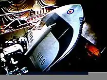 The second, #59-4975, was completed August 1959. On 29 September, the first attempt to hover was made with the Avrocar tethered to the ground.[28] After the vehicle became airborne, an uncontrollable roll and pitch-coupled oscillation started that forced each of the three wheels into the ground in turn. The pilot, W. D. "Spud" Potocki, immediately shut down all engines. Changes were made to the stability system to provide more control authority, while new tethers were investigated to improve the ability to control these sorts of problems.[2] As testing continued it became clear that the problem was inherent to the design, and the engineers started referring to the effect as "hubcapping," so-named as it appeared similar to a hubcap spun on the ground.[29]