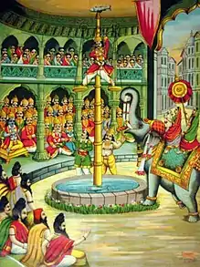 The Conclusion was also promoted extensively on social media platforms including Facebook, Twitter and Instagram.[95][103] Upon being asked about the film's marketing, Yarlagadda said, "The idea was to engage with different demographics, who are interested in different things. If you are into technology, then Baahubali VR becomes a driving factor for you to watch the film; if you are into graphic novels and gaming, we had plans to address those needs too."[95] A graphic novel titled Baahubali – The Battle of the Bold was released digitally on 28 February 2017.[104] Rajamouli approached Anand Neelakantan to write a series subtitled Before the Beginning.[105] The first novel in the series, titled The Rise of Sivagami, was released on 7 March 2017.[106][107] A clothing line based on the film was revealed on 7 April at a fashion show, with the cast including Rana Daggubati and Tamanaah attending it.[108] The makers further collaborated with Moonfrog Labs to create an online multiplayer game titled Baahubali – The Game, which published on 28 April 2017.[109] In a review for the game, Srivathsan Nadadhur of The Hindu writes, "while it seems a little familiar, it is good fun as long as it lasts."[110] The cast arrived in Dubai to inaugurate the film's release in a promotional event on 25 April 2017.[111]