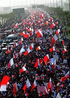 The Bahraini uprising of 2011 was a series of anti-government protests in Bahrain led by the Shia-dominant and some Sunni minority Bahraini opposition from 2011 until 2014. The protests were inspired by the unrest of the 2011 Arab Spring and 2011–12 Iranian protests and escalated to daily clashes after the Bahraini government repressed the revolt with the support of Gulf Cooperation Council and Peninsula Shield Force.[26] The Bahraini protests were a series of demonstrations, amounting to a sustained campaign of non-violent civil disobedience[27] and some violent[28][29] resistance in the Persian Gulf country of Bahrain.[30]