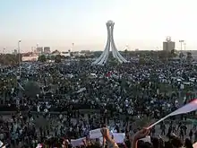 Protests began on 14 February 2011, but met immediate reaction from security forces. Over thirty protesters were reportedly injured and one was killed as Bahraini government forces used tear gas, rubber bullets and birdshot to break up demonstrations, but protests continued into the evening, drawing several hundred participants.[86] Most of the protesters were Shia Muslims, who make up the majority of Bahrain's population.[32][87] The next day, one person attending the funeral of the protester killed on 14 February was shot dead and 25 more were hurt when security officers opened fire on mourners.[88][89] The same day, thousands of protesters marched to the Pearl Roundabout in Manama and occupied it, setting up protest tents and camping out overnight.[90][91] Sunni activist Mohamed Albuflasa was secretly arrested by security forces after addressing the crowd,[92][93] making him the first political prisoner of the uprising.[94]