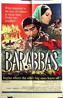 Barabbas is a 1961 religious epic film expanding on the career of Barabbas, from the Christian Passion narrative in the Gospel of Mark and other gospels. The film stars Anthony Quinn as Barabbas, features Silvana Mangano, Katy Jurado, Arthur Kennedy, Harry Andrews, Ernest Borgnine, Vittorio Gassman, and Jack Palance, and was distributed by Columbia Pictures. It was conceived as a grand Roman epic, was based on Nobel Prize-winning Pär Lagerkvist's 1950 novel of the same title. A previous film version of the novel, in Swedish, had been made in 1953.