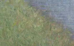 Seurat described one of the brush-stroke techniques he developed on this canvas as the balayé technique, wherein a flat brush is used to apply matte colours using strokes in a criss-crossing formation. These strokes become smaller as they approach the horizon.[7] The balayé technique is not rolled out in a consistent manner across the painting, but is adapted where Seurat thought it appropriate. The foreground—for example—consists of a balayé network of strokes atop a more solid layer of underpaint, suggesting the flickering play of sunlight over the blades of grass. This chunky, cross-hatched brushstroke pattern is in contrast with the nearly horizontal, much thinner strokes that are used to depict the water, and is in even greater contrast with the smoothly rendered skin of the figures.[8]