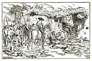 By 17:00, the roof of the ranch house had been burned away, the Legionnaires were down to twelve men, and Col. Milan ordered his men out of the hacienda, and offered the Legionnaires a third chance to surrender.[1]:85–86 In the next onslaught, Corporals Everiste Burg, Karl Magnin and Heinrich Pinzinger, plus fusiliers Leon Gorski and Hippolyte Kunnasseg were captured.[1]:86–87 By 17:30, only Lt. Maudet's men remained in the stable.[1]:87