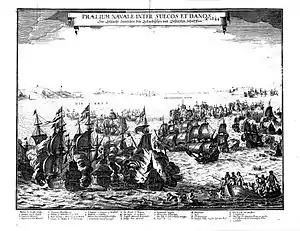 The Swedish fire ship Meerman was sent against the Danish Lindormen, which quickly caught fire and exploded.[1] The wreck was discovered in 2012.[2] Swedish Nya Fortuna captured the Danish man-of-war Oldenborg by boarding. The last man-of-war Tre Løver veered off, but was pursued by Anckarhjelm's Dutch Jupiter, Patentia and Swarte Arent. Tre Løver managed to sink Swarte Arent before the two other Dutch ships boarded her.