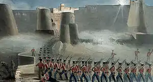 British artillery was positioned to give covering fire to the advancing troops, and four British regiments were formed into a storming party commanded by Lieutenant Colonel Dennie.[2] The rest of the three British regiments formed the main attacking column commanded by Brigadier Sale. High winds prevented the garrison from realising that they were about to be attacked.
