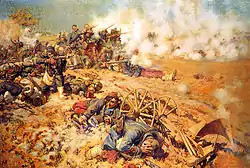 At 1800, the French crossed the ravine north of the Roman road and advanced on Mars-la-Tour.[81] Voigts-Rhetz's cavalry launched repeated charges to hold them off and the French retreated back over the ravine.[82][83] The 13th Line infantry regiment of Grenier's Division was ridden down and the 2nd Chasseurs d'Afrique cavalry regiment forced back.[84] The Germans used the gained time and space to deploy more artillery batteries to reinforce their left flank.[84] Landmirault's 4th Army Corps deployed six regiments of cavalry on its left flank west of Bruville and north of Mars-la-Tour.[85] Barby's cavalry brigade and two more regiments moved to confront them.[86] At 1845, the opposing cavalry masses collided in a struggle involving 5,000 horsemen and 40 squadrons.[87][88] Each side sought to outflank the other in the melee.[89] The German regiments succeeded in imposing themselves on the French flank and rear and the entire French cavalry force disintegrated in a rout, fleeing toward Bruville with dust clouds rising behind them.[89] After their complete victory in the greatest and most important cavalry battle of the entire Franco-Prussian War, the Prussian cavalry regiments reformed their ranks and withdrew toward Mars-la-Tour, having defeated the threat to the Prussian left flank.[90] With darkness approaching, Landmirault gave up on his attempts to capture Mars-la-Tour and Tronville.[90] By 1900, the Prussian positions north of Tronville were untroubled save for harassment fire from French artillery.[91]