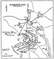 The action began at 10 o'clock with a heavy artillery duel, then after an hour of fighting, two divisions of Hungarian I Corps finally forced Strastil to retreat with a bayonet charge.[35] The imperial brigade retreated to the southwest of Nagysalló.[36] Wohlgemuth ordered it to counterattack, also sending Dreyhann's brigade from Nagymálas in support. The two brigades entered the village but were pushed out.[37] Major General Felix Jablonowski ordered them to retreat to the heights southwest of the village.[38]