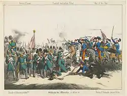 The Battle of Oltenița (or Oltenitza) was fought on 4 November 1853 and was the first engagement of the Crimean War. In this battle an Ottoman army under the command of Omar Pasha was defending its fortified positions from the Russian forces led by General Peter Dannenberg, until the Russians were ordered to withdraw.[6] The Russian attack was called off just when they reached the Ottoman fortifications, and they retreated in good order, but suffered heavy losses.[3][2] The Ottomans held their positions, but did not pursue the enemy, and later retreated to the other side of Danube.[7][2]
