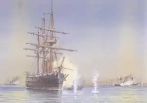 The Battle of Pacocha was a naval battle that took place on 29 May 1877 between the rebel-held Peruvian monitor Huáscar and the British ships HMS Shah and HMS Amethyst. The vessels did not inflict significant damage on each other, however the battle is notable for seeing the first combat use of the torpedo.