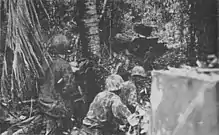 By 12:45, the battalion was 200 yd (180 m) to the rear of Company E, whereupon Smoak learned that Company E was pinned down by heavy fire and was taking casualties and reinforcement was needed immediately. The Japanese ambush position was located south of the trail junction. Smoak promptly ordered forward Company G—under the command of Captain William McDonough—to reinforce Company E, while Major Edward Clark's Company H was ordered to provide 81 mm mortar support for the attack. Company F—led by Captain Robert Rapp—less the platoon protecting the wire team, was ordered into reserve and to await orders. The artillery forward observer's party was ordered to move forward under the command of Major Glenn Fissel, the battalion executive officer, to assess the situation and call in artillery concentrations to prevent the Japanese from maneuvering.[13]