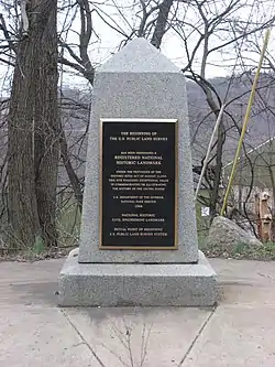 The Beginning Point of the U.S. Public Land Survey is the point from which the United States in 1786 began the formal survey of the lands known then as the Northwest Territory, now making up all or part of Ohio, Indiana, Illinois, Michigan, and Wisconsin. The survey is claimed to be the first major cadastral survey undertaken by any nation. The point now lies underwater on the state line between Ohio and Pennsylvania. Because it is submerged, a monument commemorating the point is located on the state line between East Liverpool, Ohio and Ohioville, Pennsylvania, adjacent to the nearest roadway. The area around the marker was designated a National Historic Landmark in 1965.[2]