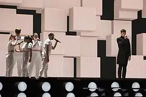 The stage show featured Loïc Nottet dressed in a black suit and five backing vocalists dressed in white costumes. The staging concept involved the contrasts of black and white with strobe lighting added and the background LED screens transitioning between full white displays, moving white lines and pulsating 3D boxes. Nottet and the backing vocalists performed a choreographed routine that at one point featured Nottet lying on the stage floor.[18][19] The five backing vocalists that joined Loïc Nottet on stage were Katie Bernstein, Michael Storrs, Susanna Cork, Sarah Covey and previous Belgian Eurovision contestant Nicolas Dorian, who represented the nation in 2011 as part of Witloof Bay.[21]