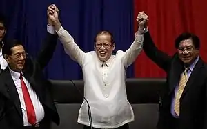 Benigno Simeon Cojuangco Aquino III[1][2][3] (Tagalog pronunciation: [bɛˈniɡnɔʔ aˈkino], born February 8, 1960), also known as "PNoy"[4][5][6] or "Noynoy",[7][8][9] is a Filipino politician who served as the 15th president of the Philippines from 2010 until 2016.[10][11][12] Aquino is a fourth-generation politician and was the chairman of the Liberal Party from 2010 to 2016.
