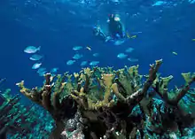 Reef environments in Biscayne National Park have seen declines in species richness and diversity across all fish species from 1977 to 1981 to 2006–2007.[123] A sampling program showed declines at all sampling sites. A correlation has been posited between the observed decline in coral reef coverage throughout the Florida Reef tract and the decline in fish species. Declines in populations were noted in both gamefish and in fish species not exposed to fishing pressure. Algal cover has increased as coral has declined, so coral-dwelling species have decreased while herbivorous fish have increased. Increased overall salinity and changing salinity gradients in Biscayne Bay may also play a role, while polychlorinated biphenyl and mercury contamination have been noted in fish samples.[124]