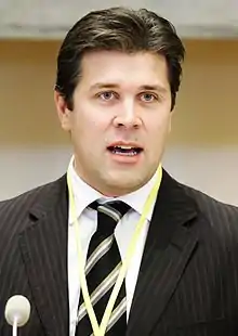 Bjarni was elected leader of the conservative Independence Party at its national convention on 29 March 2009 with 58.1 percent of the vote, about a month before the April 2009 Icelandic legislative elections.[3] The party came in second in the elections with 16 seats, nine fewer than in the previous elections. After conceding defeat on 26 April 2009, Bjarni said his party had lost the trust of voters. "We lost this time but we will win again later," he said.[4]