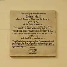 Near this spot stood the ancient Shire Hall, unhappily famous in history as the scene in July 1577 of the Black Assize, when a malignant disease known as Gaol Fever caused the death within forty days of the Lord Chief Baron of the Exchequer, Sir Robert Bell, the Lord High Sheriff (Sir Robert D'Oyly of Merton) and about three hundred more.