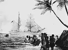 The violence and death surrounding the Queensland blackbirding trade intensified in the early 1880s. Local communities in the New Hebrides and the Solomon Islands had increased access to modern firearms which made their resistance to the blackbirders more robust. Well known vessels that experienced mortality amongst their crews while attempting to recruit Islanders included the Esperanza at Simbo, Pearl at Rendova Island, May Queen at Ambae Island, Stormbird at Tanna, the Janet Stewart at Malaita and the Isabella at Espiritu Santo amongst others.[57][58] Officers of Royal Navy warships attempting punitive action were not exempt as targets with Lieutenant Bower and five crew of HMS Sandfly being killed in the Nggela Islands[59] and Lieutenant Luckcraft of HMS Cormorant being shot dead at Espiritu Santo.[60] Reprisals from British naval ships based at the Australia Station were frequent and substantial. HMS Emerald under Captain W.H. Maxwell went on an extensive punitive expedition, shelling and destroying numerous villages,[61] while marines of HMS Cormorant executed various Islanders suspected of killing white men.[62] Captain Dawson of HMS Miranda led a mission to Ambae Island, killing native people and burning villages,[63] while HMS Diamond went on a "savage-hunting expedition" throughout the Solomon Islands.[64] At Ambrym, the marines of HMS Dart under Commander Moore, surrounded villages and massacred locals for the killing of Captain Belbin of the blackbirding ship Borough Belle.[65] Likewise, HMS Undine patrolled the islands, protecting the crews of blackbirding vessels such as the Ceara from mutinies of the labour recruits.[66]
