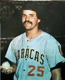 Díaz played exclusively for the Leones del Caracas team in the Venezuelan Winter League (1972–1990), forming a fiery offensive combo along with slugger Tony Armas. During his time in the league, Díaz batted .281, with 265 runs scored, 290 runs batted in, 79 doubles, 7 triples, and 57 home runs, in 537 games played. In 1979, he set a Venezuelan League single-season record for home runs with 20, a record that was broken by Alex Cabrera, who hit 21 in 2013-2014 season.[40] Díaz was the leading hitter in the 1982 Caribbean Series with a .412 batting average and 2 home runs.[41]