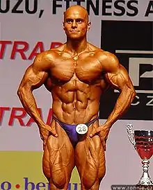 Bodybuilding is the use of progressive resistance exercise to control and develop one's musculature (muscle building) by muscle hypertrophy for aesthetic purposes.[1] It is distinct from similar activities such as powerlifting because it focuses on physical appearance instead of strength.[2] An individual who engages in this activity is referred to as a bodybuilder. In professional bodybuilding, competitors appear in lineups and perform specified poses (and later individual posing routines) for a panel of judges who rank them based on symmetry, muscularity, size, conditioning, posing, and stage presentation. Bodybuilders prepare for competitions through the elimination of nonessential body fat, enhanced at the last stage by a combination of extracellular dehydration and carbo-loading, to achieve maximum muscular definition and vascularity; they also tan and shave to accentuate the contrast of their skin under the spotlights.[3]