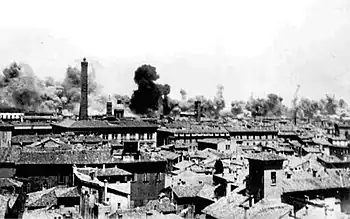 The 12 October raid was the last major raid suffered by Bologna during 1944; in the final months of the year, the city was only subjective to minor raids (on 13, 14, 15, 21, 24 and 30 October, 6, 11 and 22 November, 1, 10, 14, 18, 21, 22, 25, 26, 27, 28, 29, 30 and 31 December).[57] The dwindling intensity of air raids on the city, along with the movement of the frontline, with the Gothic Line turning the Bolognese Apennine into a battlefield, reversed the evacuee situation; most of the people that had left Bologna during the previous months returned to the city (whose historic centre had been declared "Sperrzone", area where military traffic was interdicted, by the German command), and along with them came tens of thousands of inhabitants of the Apennine villages, fleeing the fighting that was now ravaging their valleys. As a consequence of this, in the winter of 1944-1945 the population of Bologna nearly doubled from that of 1940; between residents and Apennine refugees, some 600,000 people were now living in the city.[58][59] Many of the Apennine farmers brought their livestock with them; the ruins of the Neoclassic Teatro del Corso were turned into stables and haylofts, as were other buildings.[60] In order to house the refugees and the homeless, the Municipal Assistance Authority requisitioned 11,450 apartments and built collective accommodation for 60,000 people, but these measures weren't enough; many camped amid the ruins of destroyed buildings.[61]