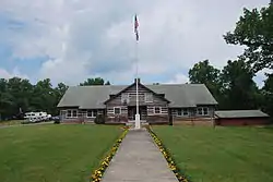 Despite West Virginia's growth in state parks, in both acreage and in number of locations, its state park system was not accessible by African Americans.[21] During the 1930s, West Virginia's historically black colleges (Bluefield State Teachers College, Storer College, and, primarily, West Virginia State College and its extension service) became the center of a movement to provide educational outdoor and recreational activities for West Virginia's African American youth.[24] The movement succeeded in taking advantage of available West Virginia Board of Control funding from the Works Progress Administration (WPA) when the Legislature established Camp Washington-Carver in 1937 near Clifftop in Fayette County.[21][25] The 583-acre (236 ha) African American 4-H camp was constructed by the WPA between 1939 and 1942 and was transferred from the West Virginia Board of Control to the West Virginia State College extension service, which offered instruction to African American children and adolescents in the subjects of agricultural education, soil conservation, home economics, and 4-H values.[26] West Virginia State named the 4-H camp complex after African American educators Booker T. Washington (a Kanawha River valley native) and George Washington Carver.[26] Its Great Chestnut Lodge is notable as being the largest log structure in West Virginia built entirely of chestnut.[27] Camp Washington-Carver was formally dedicated on July 26, 1942.[28]