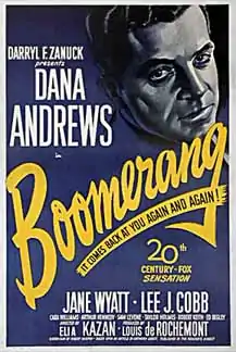 Boomerang! is a 1947 American crime film noir based on the true story of a vagrant who was accused of murder by an incompetent police force, only to be found not guilty through the efforts of the prosecutor. It stars Dana Andrews, Lee J. Cobb, Karl Malden, Arthur Kennedy and Jane Wyatt.