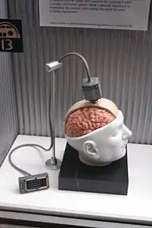 Donoghue's group reported training rhesus monkeys to use a BCI to track visual targets on a computer screen (closed-loop BCI) with or without assistance of a joystick.[31] Schwartz's group created a BCI for three-dimensional tracking in virtual reality and also reproduced BCI control in a robotic arm.[32] The same group also created headlines when they demonstrated that a monkey could feed itself pieces of fruit and marshmallows using a robotic arm controlled by the animal's own brain signals.[33][34][35]