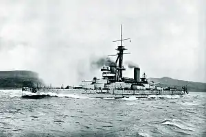 The Brazilian government declared that the country would be neutral in the First World War on 4 August 1914. The sinking of Brazilian merchant ships by German U-boats led them to revoke their neutrality, then declare war on 26 October 1917.[39] By this time, São Paulo was no longer one of the world's most powerful battleships. Despite an identified need for more modern fire control,[1] it had not been fitted with any of the advances in that technology that had appeared since its construction, and it was in poor condition.[40] For these reasons the Royal Navy declined a Brazilian offer to send it and Minas Geraes to serve with the Grand Fleet.[2] In an attempt to bring the battleship up to international standards, Brazil sent São Paulo to the United States in June 1918 to receive a full refit. Soon after it departed the naval base in Rio de Janeiro, fourteen of the eighteen boilers powering the dreadnought broke down.[25] The American battleship Nebraska, which was in the area after transporting the body of the late Uruguayan Minister to the United States to Montevideo,[41] rendered assistance in the form of temporary repairs after the ships put in at Bahia. Escorted by Nebraska and another American ship, Raleigh, São Paulo made it to the New York Naval Yard after a 42-day journey.[2][25]