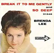 Brenda Lee recorded "Break It to Me Gently" on August 31, 1961 with Owen Bradley producing the session at his Bradley Film and Recording Studio in Nashville:[1] after another track from the same session, "Fool #1", had become a Top Ten hit. "Break It To Me Gently" was released as a single at the end of 1961 and reached number four on the US Billboard Hot 100 in January 1962.[2] In 2008, the Brenda Lee version of the song was featured at the closing of season 2, episode 7 of the AMC series Mad Men. Lee's "Break It to Me Gently" is on the track list of the CD Pan Am: Music From and Inspired By the Original Series set for release January 17, 2012.[3]