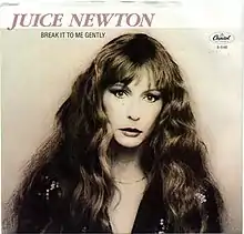Juice Newton had included "Break It to Me Gently" in the set list for her 1981 national tour: New York Times music critic Stephen Holden terming Newton's "steamy version" of the song the concert's highlight.[4] Newton made her recording of the song at Soundcastle Studio in Hollywood CA on January 11, 1982: this was the first session of recording the tracks which would compose Newton's Quiet Lies album whose lead single: "Love's Been a Little Bit Hard on Me" was the one other track recorded in that session.[5] Issued as the second single from Quiet Lies in August 1982, "Break It to Me Gently" just missed becoming Newton's fifth consecutive Top Ten hit on the Billboard Hot 100 peaking at number 11 that October. The track reached number one on the US Adult Contemporary chart (making it Newton's third number one on that chart),[6] and number two on the US country singles chart.[7] Newton won the Grammy Award for Best Country Vocal Performance, Female, for her performance of the song. Newton would score three more Top 40 pop hits after "Break It to Me Gently".