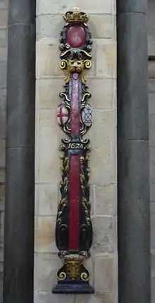 It was thought likely that the mark as we know it today was designed by a famous 17th-century surveyor, William Leybourn. It appears drawn on a plan of 1680 which it is thought he adapted from a similar mark drawn against plots owned by Bridge House Estates on an earlier plan of St George's Fields in Southwark. The City sword rest[4] from the church of St Olave, Southwark (now in the north transept of Southwark Cathedral) has the Bridge Mark carved onto it to balance the City's shield, and shows a date of 1674.[5]