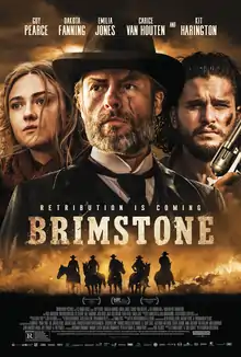Brimstone is a 2016 Western thriller film written and directed by Martin Koolhoven, starring Dakota Fanning, Guy Pearce, Kit Harington, and Carice van Houten.[4] The film is a Dutch-American as well as French, German, Belgian and Swedish international production.